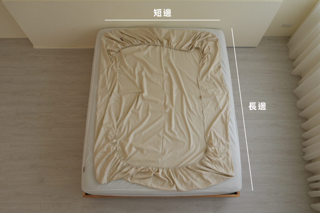 在開始教學床包折法之前,我們要先來分辨床包的長邊與短邊,以免判斷錯誤,導致折好後的形狀會不整齊,床包收納體積也會變大。首先,可以利用手臂將床包撐開,如果可以輕鬆撐開,拉至最大寬度,代表那一側為「短邊」。若張開後間距較長,無法完整將床包攤開,代表那一側為「長邊」。