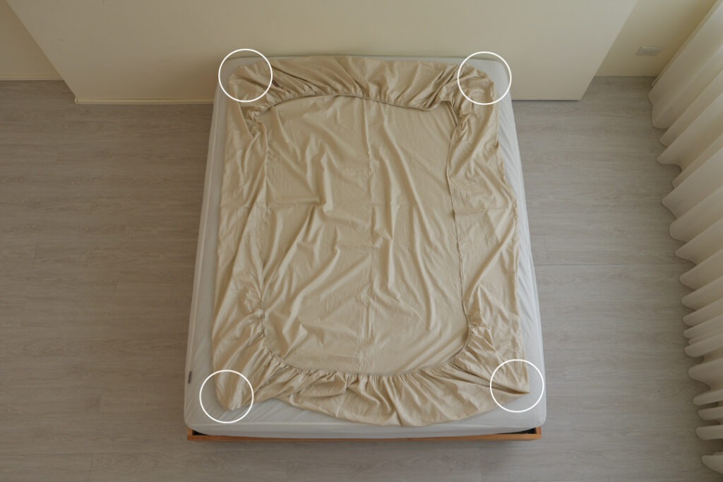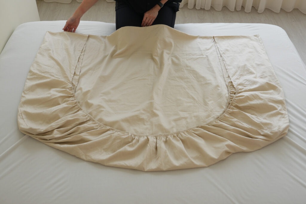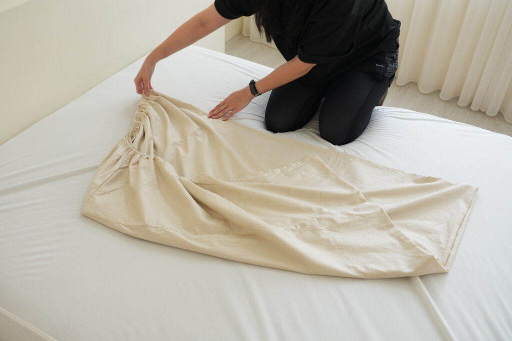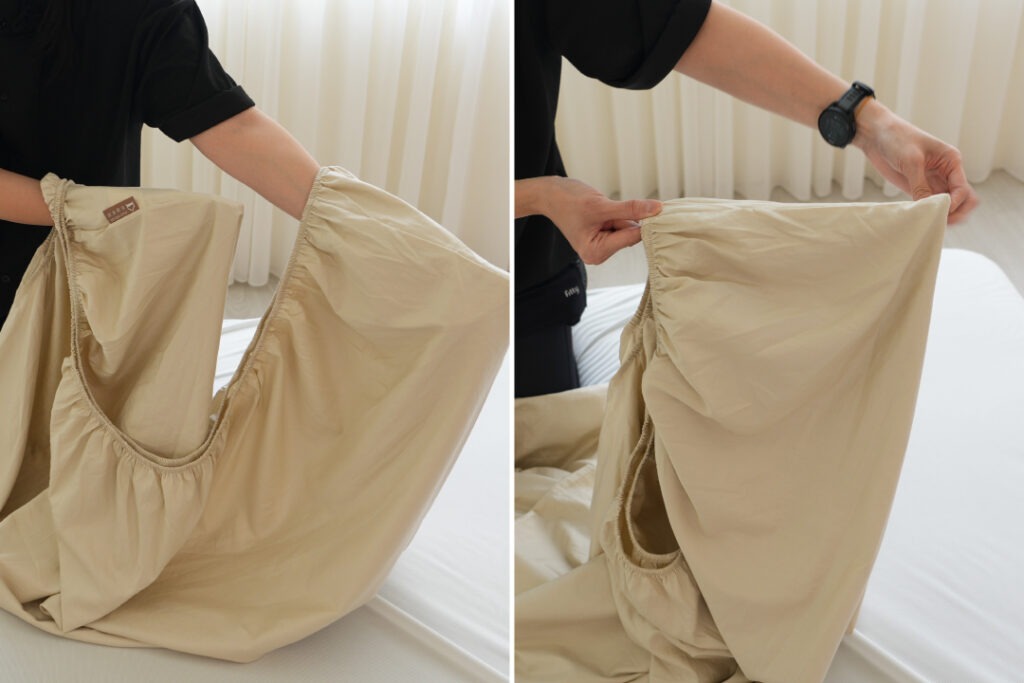 將床包完全攤開於床鋪上後,伸手沿著邊緣摸索四個鬆緊帶角的位置,並將手伸進床包內,把每個角往外撐開確認形狀。