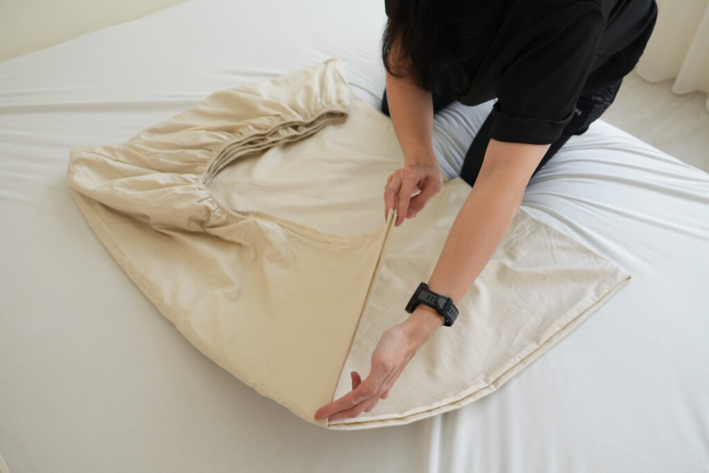 掌握正確的床包折法,不僅能有效縮小收納體積,也能讓鬆緊帶服貼不鼓起,只要依序找到四個角、互相套疊並鋪平,再依照邊線折出正方形狀,就能讓原本蓬鬆的床包瞬間變得服貼好收納,也能增加日後更換床單的便利性。