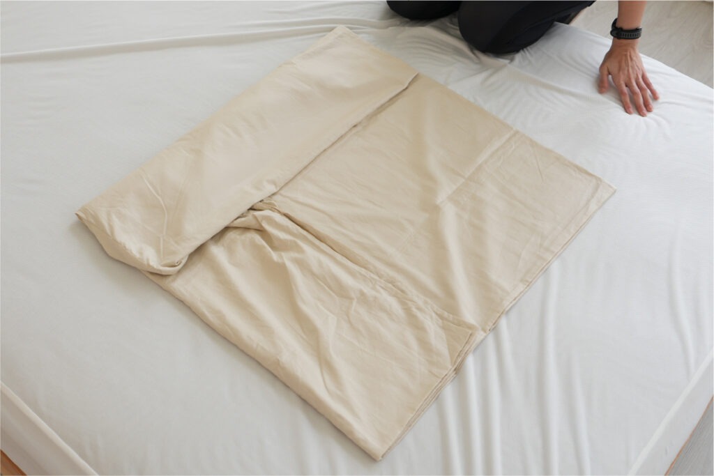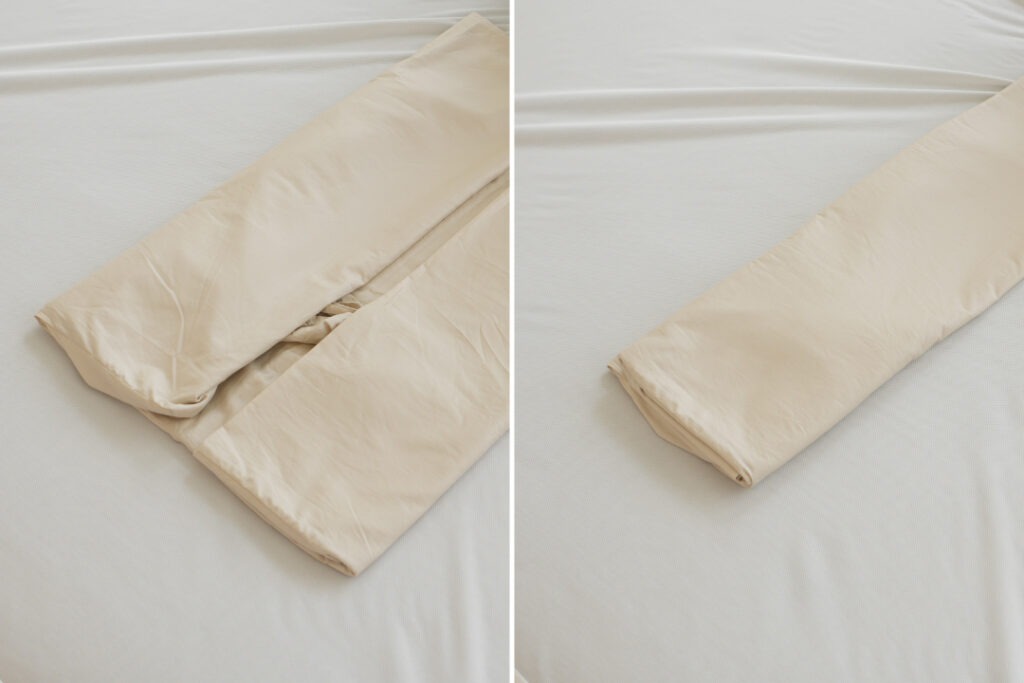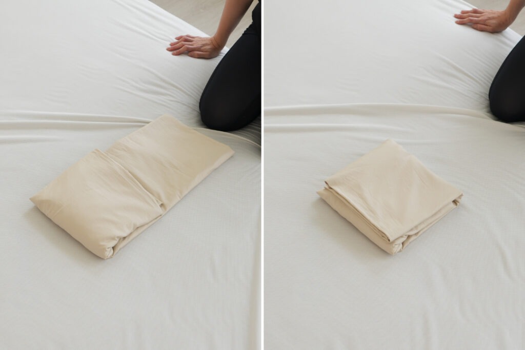 將長方形的左右兩側各向內折一半,以壓縮整體寬度。折好後,將窄邊向上折(約整體的三分之一)兩次,讓床包呈現出平整的矩形就完成了。